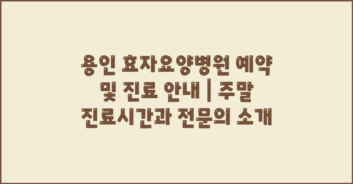 용인 효자요양병원 예약 및 진료 안내 | 주말 진료시간과 전문의 정보는 여러분의 소중한 가족이 건강하게 지낼 수 있도록 돕기 위한 것입니다. 필요한 정보가 충분히 안내되었기를 바라며, 여러분의 건강을 기원합니다. 용인 효자요양병원에서는 항상 환자분들을 위해 친절한 서비스를 제공하고 있으니, 언제든지 문의해 주세요!